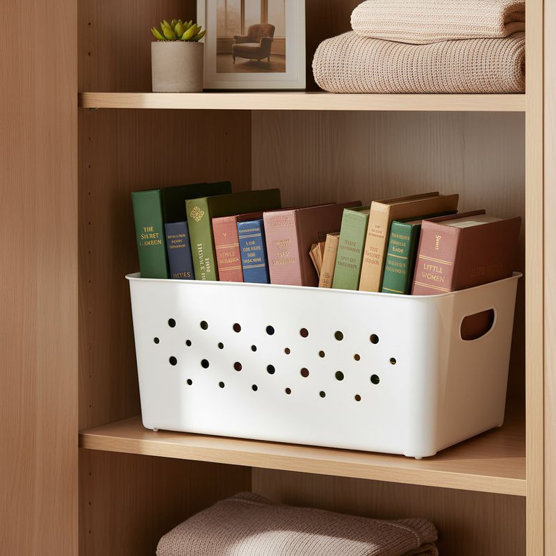 Color blanco, limpio, elegante y fácil de combinar con cualquier decoración. Fabricada en plástico durable, ligera, práctica y fácil de limpiar. Perfecta para cocinas, baños, closets, oficinas, cuartos de lavado o áreas de juego. Diseño estable, apilable y con bordes cómodos para un agarre seguro. Esta caja no solo organiza, sino que también embellece tus espacios, aportando orden, frescura y funcionalidad en un solo producto.