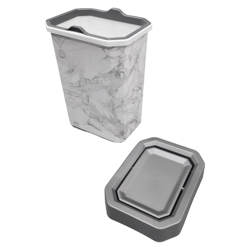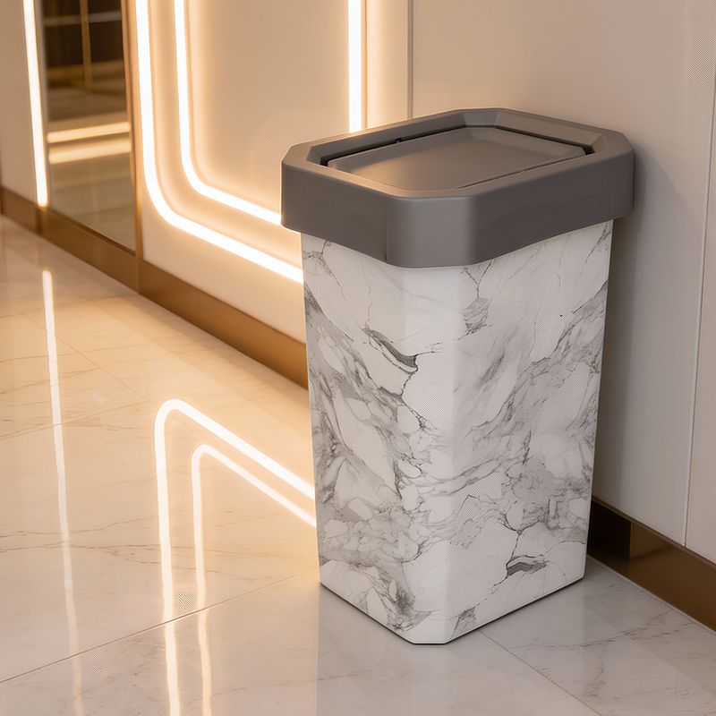 tapa vaivén facilita el depósito de residuos de manera práctica e higiénica, permitiendo un uso continuo sin necesidad de manipular directamente la tapa. Su diseño moderno con acabado tipo mármol y decoración con tecnología IML aporta un estilo elegante que complementa cualquier ambiente.