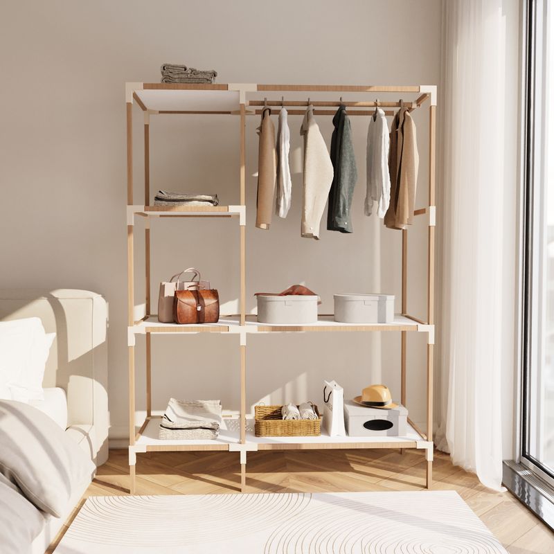 Organiza tu ropa y accesorios con estilo gracias a este elegante clóset de madera en color beige. Con amplio espacio interior, es perfecto para mantener tu vestimenta ordenada y al alcance de la mano, añadiendo un toque de calidez a tu dormitorio.