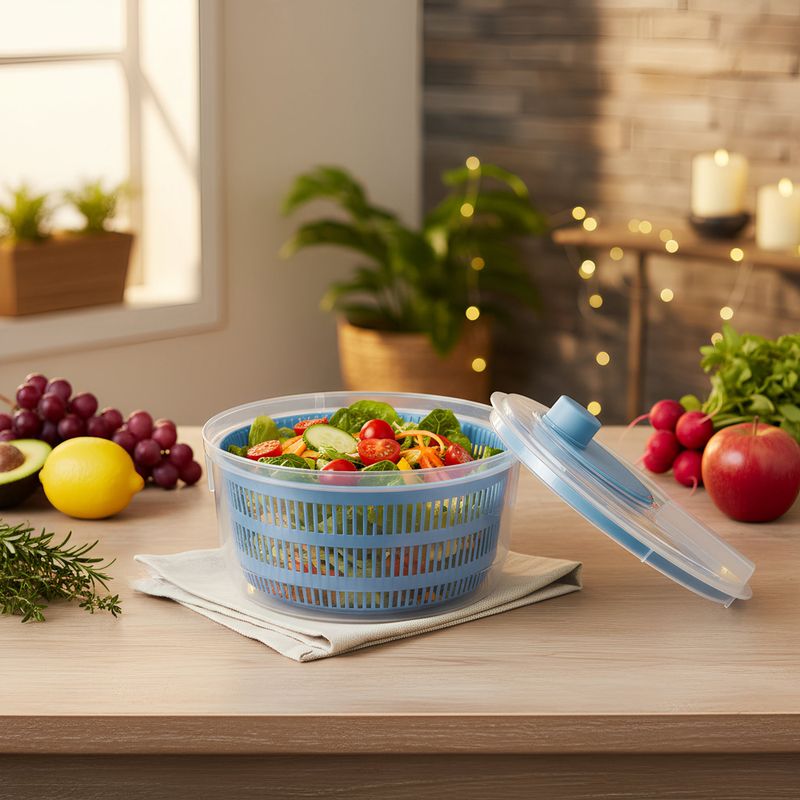 Este sistema, simple pero robusto, permite secar verduras, hortalizas y frutas con un movimiento manual cómodo y sin esfuerzo. Capacidad ideal para el hogar Con una capacidad de 4 litros, este modelo es perfecto para preparar porciones familiares de forma práctica. Su tamaño permite lavar desde hojas verdes como lechuga y espinaca, hasta ingredientes más compactos como uvas o vegetales troceados. Material resistente y colores surtidos El escurridor está fabricado en plástico de alta calidad, ideal para un uso frecuente.