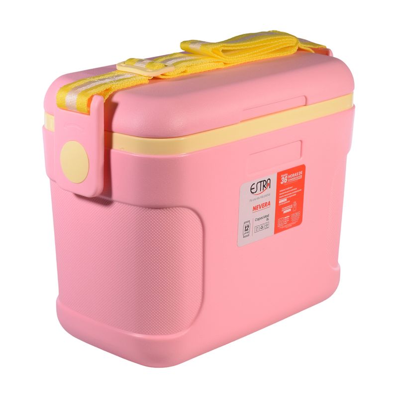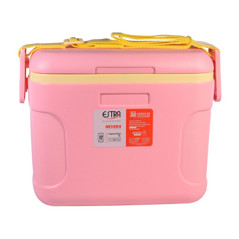 Diseño compacto y atractivo Esta nevera destaca por su color rosado suave, que transmite frescura y modernidad. Los detalles en tono amarillo en la tapa y el asa aportan un contraste agradable y juvenil, haciendo que el producto resulte llamativo y diferente a las neveras portátiles tradicionales. Su forma rectangular con bordes redondeados facilita el transporte y el almacenamiento, además de aportar un acabado más estético y seguro frente a golpes leves.