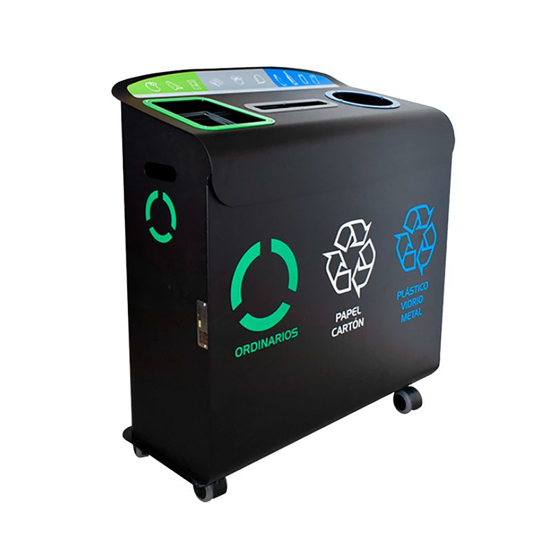 Diseño pensado para facilitar el reciclaje El Punto Ecológico Icona S está compuesto por tres compartimentos con contenedores plásticos internos, lo que permite una separación eficiente de residuos como reciclables, orgánicos y ordinarios. Esta división clara es fundamental para fomentar una cultura de reciclaje tanto en oficinas como en colegios, centros comerciales o espacios institucionales.