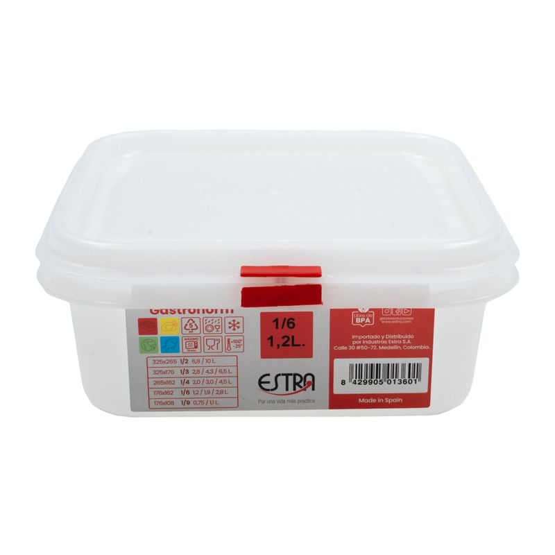 Con una capacidad de 1,2 litros, este recipiente Gastronorm 1/6 ofrece el equilibrio perfecto entre tamaño compacto y espacio suficiente para conservar porciones individuales o ingredientes específicos. Su forma cuadrada permite un aprovechamiento óptimo del espacio en refrigeradores, mesas frías o estanterías, facilitando el apilado y la manipulación durante las operaciones diarias.