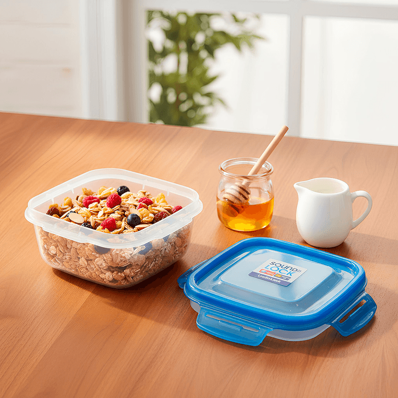 Con una capacidad intermedia, el Recipiente Cuadrado Soundlock 560ML Azul es ideal para ensaladas individuales, frutas o comidas ligeras. Su forma cuadrada facilita el orden y el apilamiento.