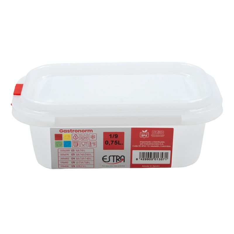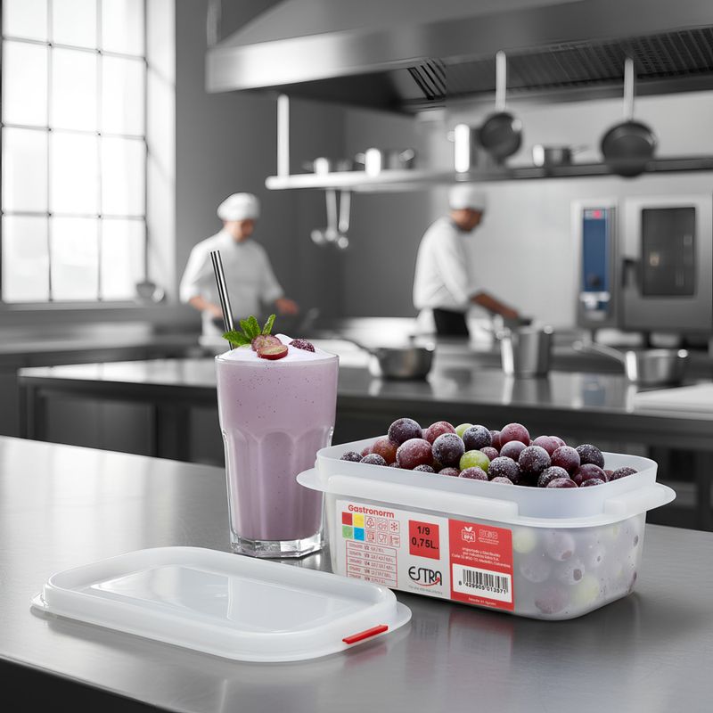 Capacidad ideal y formato Gastronorm Con una capacidad de 0,75L, este modelo es perfecto para conservar porciones medianas de alimentos, salsas, guarniciones o ingredientes listos para servir. Su formato 1/9 Gastronorm garantiza compatibilidad con bandejas, vitrinas y equipos de cocina estándar, facilitando su integración en entornos gastronómicos profesionales. Identificación rápida y segura por código de color Una de sus mayores ventajas es su sistema de código de color, diseñado para identificar fácilmente el tipo de alimento contenido sin necesidad de abrirlo.