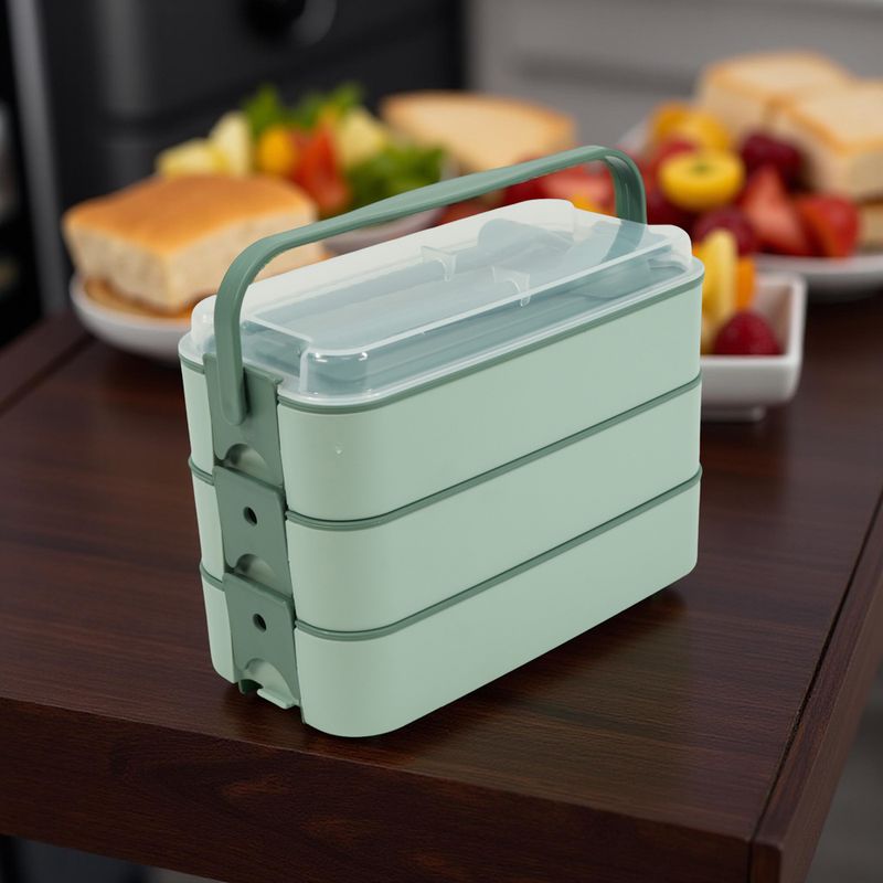 Organización eficiente: tres recipientes que permiten separar y conservar distintos tipos de alimentos. Practicidad en el transporte: gracias a la manija y los cubiertos incluidos, se convierte en un set completo. Durabilidad y resistencia: fabricados en plástico de calidad, soportan el uso cotidiano.